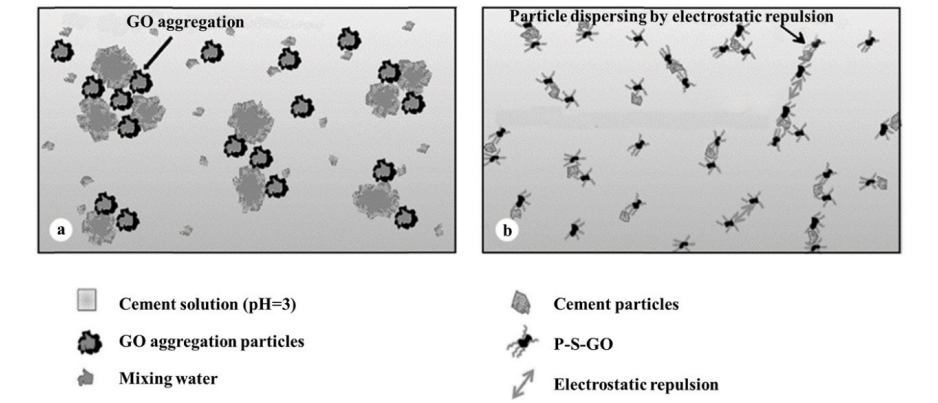 圖11. (a)氧化石墨烯和(b)功能化氧化石墨烯在水泥漿體中的分散機理示意圖。