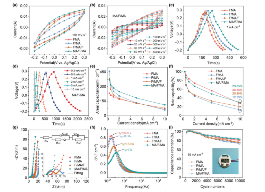 −1的高SSE/t。組裝的非對稱MA/F/MA//TOCNF@CNT(碳納米管)超級電容器在功率密度為777.26 μW cm