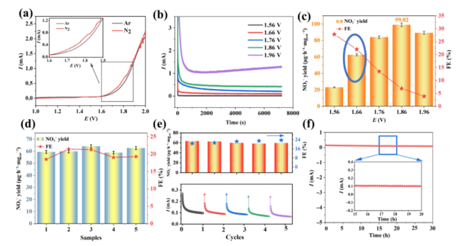 圖2. (a)在施加電勢從1.56 V到1.96 V的n2飽和和ar飽和0.1 M KOH電解質(zhì)中TiO2−x/Cu-NWs電極的LSV曲線(插圖:NOR反應(yīng)的電勢范圍的放大視圖)。(b)不同電位時(shí)安培曲線。(c)不同電位下的NO3 -產(chǎn)率和FE。(d)可重復(fù)性試驗(yàn)。(e)循環(huán)穩(wěn)定性試驗(yàn)。(f)長期穩(wěn)定性試驗(yàn)。