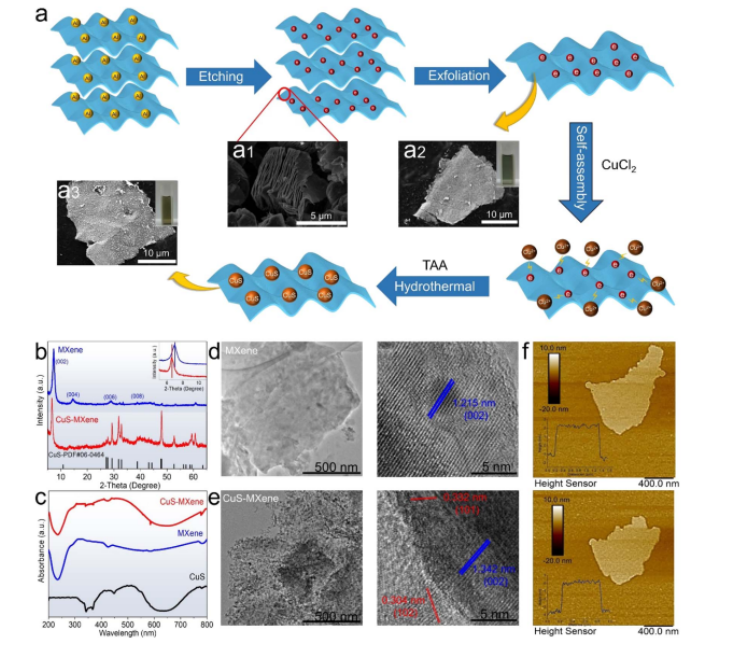 圖1. (a) CuS-MXene合成工藝流程圖及(a1)多層MXene、(a2)片狀MXene、(a3)片狀CuS-MXene的SEM圖像。(b) MXene和CuS-MXene的XRD譜圖。(c) MXene、CuS和CuS - MXene的紫外-可見吸收光譜。(d) MXene和(e) CuS-MXene的TEM和HRTEM圖像。(f) AFM圖像和MXene(上)和CuS-MXene(下)的高度輪廓。