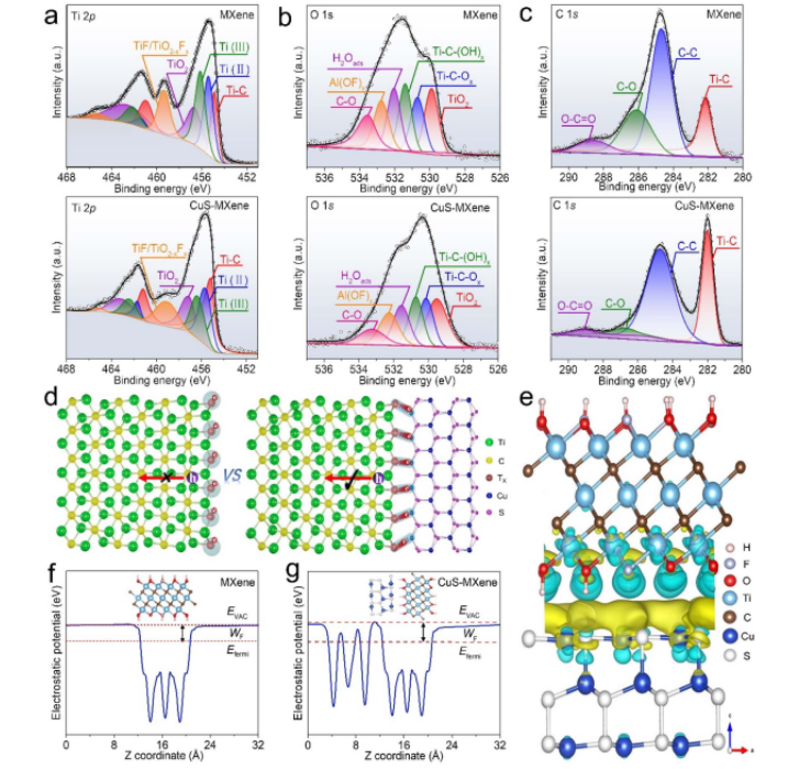 圖2. MXene和CuS-MXene的高分辨XPS光譜(a) Ti 2p, (b) O 1s和(c) c 1s。(d) MXene中空穴定位和CuS-MXene中空穴離域示意圖。(e) CuS-MXene異質(zhì)結(jié)的電荷密度差。計算得到(f) MXene和(g) CuS-MXene的功函數(shù)。