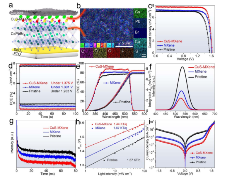 3/CuS/MXene界面橋,實(shí)現(xiàn)了快速空穴傳輸和良好的界面接觸。Pb-S鍵和MXene的電子給體基團(tuán)進(jìn)一步鈍化了鈣鈦礦表面的阱態(tài),從根本上減少了界面電荷復(fù)合。最后,使用CuS-MXene定制的無封裝CsPbBr