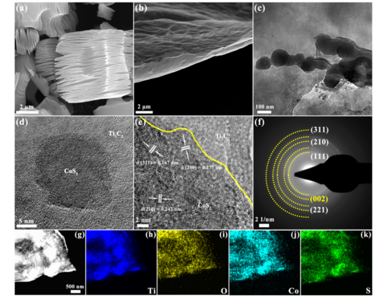 2納米片的SEM圖像。(c) TEM,(d, e) HRTEM,(f) SAED和(g−k) EDS映射圖。