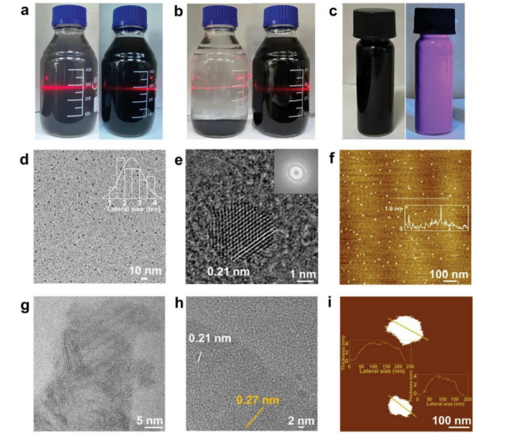 3-GQDs 的 TEM 圖像 (d)、高分辨率 TEM 圖像 (e) 和 AFM 圖像 (f); ALMS 的 TEM 圖像 (g)、高分辨率 TEM 圖像 (h) 和 AFM 圖像 (i)。