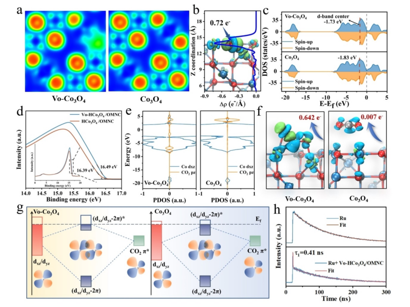 2的光還原。原位光譜和從頭算分子動力學(xué)模擬表明,構(gòu)建的氧空位能夠打破Co-O-Co位點的局部結(jié)構(gòu)對稱性。不對稱活性位點的形成將CO