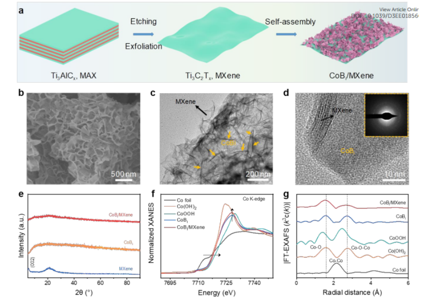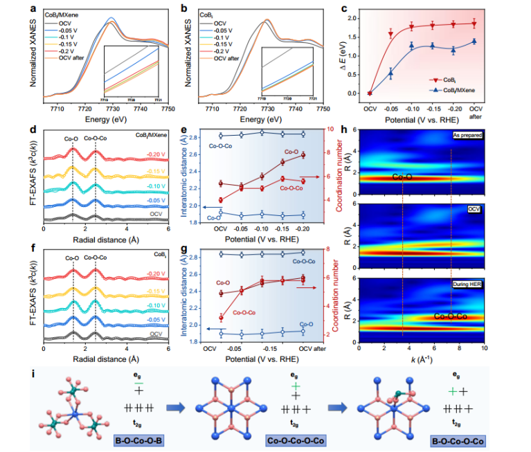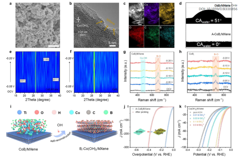 2逐漸在親水性MXene納米片上形成,并動(dòng)態(tài)增強(qiáng)了HER活性。具體來說,硼酸鹽配位的Co(OH)