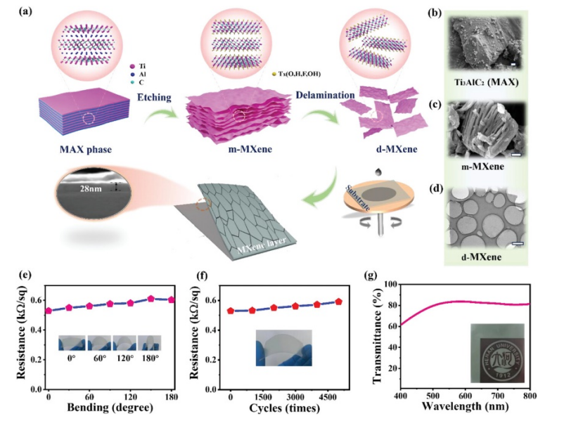 e) MXene電極在0°至180°不同彎曲角度下的電阻。 f) MXene 電極經(jīng)過 5000 次彎曲循環(huán)(彎曲角度 120°)后的電阻。 g) Ti