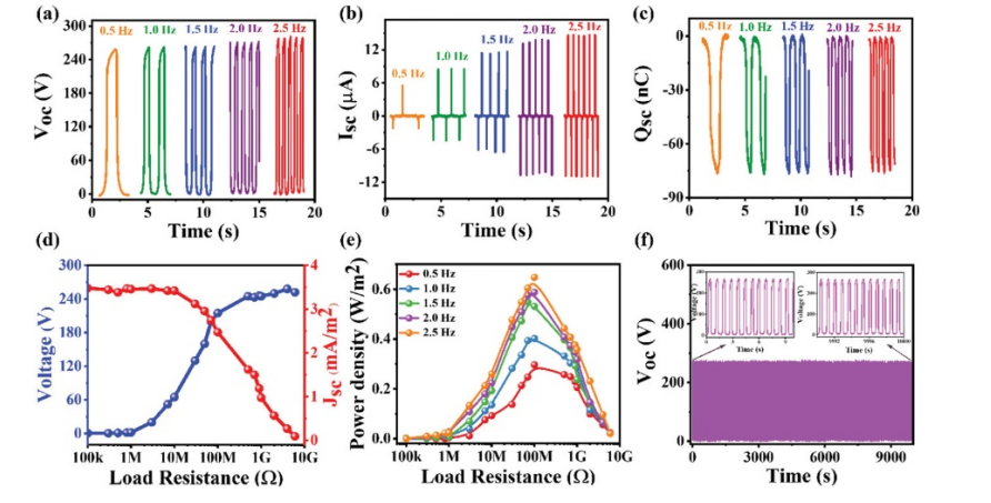 Fig 3. MS-TENG 的電輸出性能。a–c) 不同工作頻率(0.5–2.5 Hz)下的電輸出性能(VOC、QSC 和 ISC)。d) 電氣輸出性能與外部負(fù)載的關(guān)系。e) 不同外部負(fù)載電阻下不同運動頻率的輸出功率密度。f) MS-TENG 104 個接觸-分離周期的實時電壓輸出。