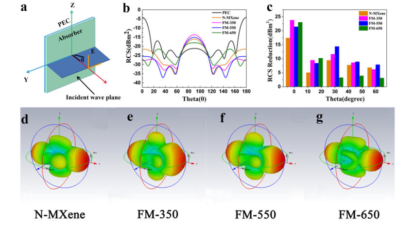 圖7。(a) RCS仿真模型,(b、c)模擬RCS值,(d−g) N-MXene、FM-350、FM-550和FM-650的三維雷達(dá)散射結(jié)果。
