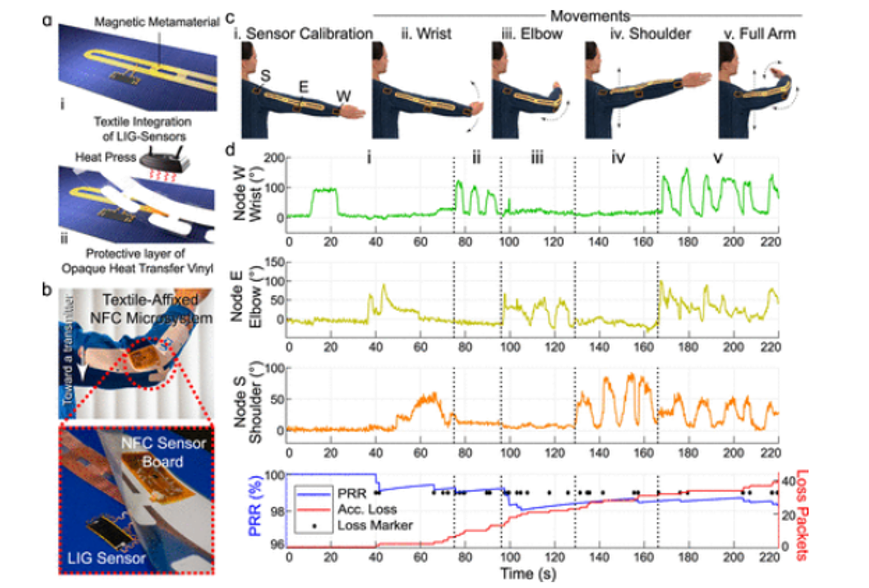 圖5.通過基于LIG的“智能”無電池服裝進行多節(jié)點姿勢監(jiān)測。(a) 諧振器和紡織LIG傳感器的制造和集成示意圖。(b) 在肩膀、肘部和手腕上安裝LIG應變傳感器,連接到NFC集線器,并通過紡織品集成波導進行無線通信。(c) 人類受試者的運動產(chǎn)生(d)傳感器數(shù)據(jù),顯示手腕、肘部和肩部的順序彎曲,然后同時彎曲所有三個關(guān)節(jié)。