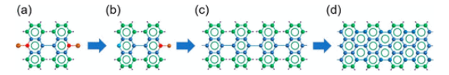 圖1.(a) DBBA的化學(xué)結(jié)構(gòu),(b)前體單體的部分脫溴,(c)聚合的分子鏈,和(d)7-石墨烯納米帶(7-GNR)。不同的顏色顯示不同的原子種類:溴原子呈紅色;與氫原子連接的碳原子被著色為綠色;芳香環(huán)中僅與其他碳原子連接的碳原子被著色為藍(lán)色;并且與溴原子沒有連接的碳原子被著色為淡藍(lán)色。