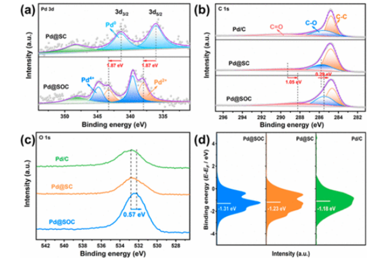 圖2.(a) Pd的三維XPS光譜Pd@SOC和Pd@SC;(b) Pd/C的C1s和(C)O1s XPS光譜,Pd@SC和