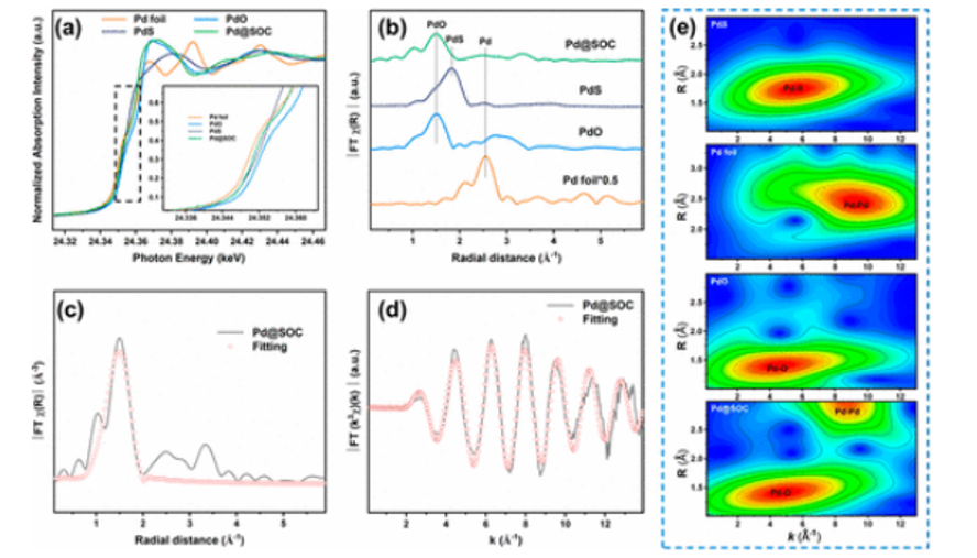 圖3. Pd K邊XANES譜(a)和EXAFS譜(b)Pd@SOC(插圖:突出顯示區(qū)域的擴(kuò)展);的k空間中的R空間(c,d)