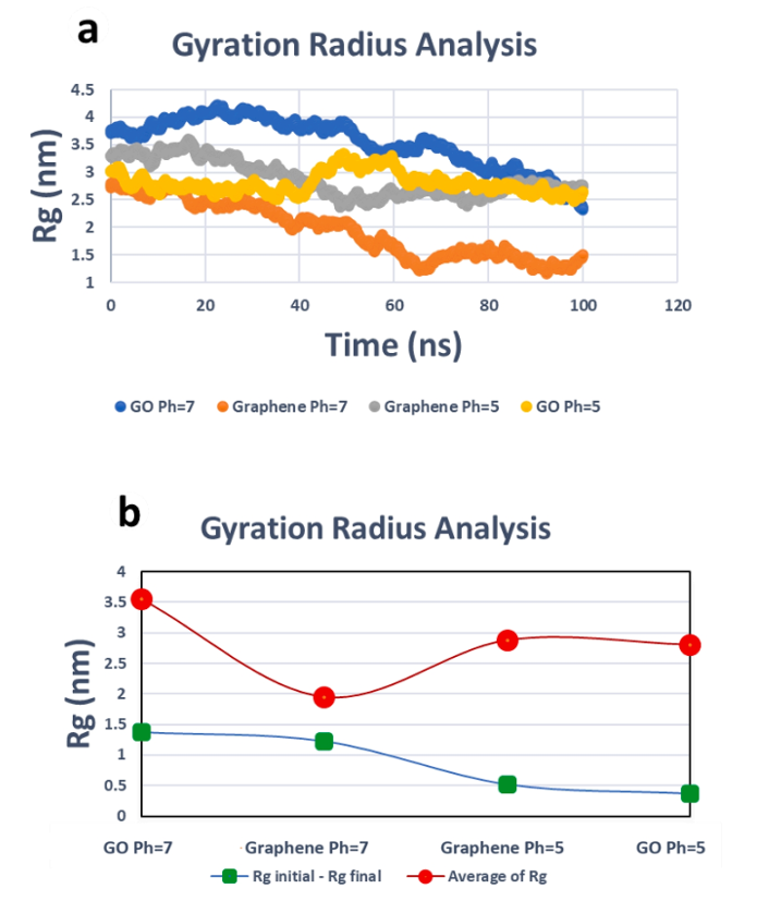 圖2. 含DOX藥物的氧化石墨烯(GO)和石墨烯在pH=7和pH=5時(shí)隨時(shí)間的回轉(zhuǎn)半徑(Rg)分析:(a)回轉(zhuǎn)半徑的時(shí)間依賴性,(b)平均Rg值。