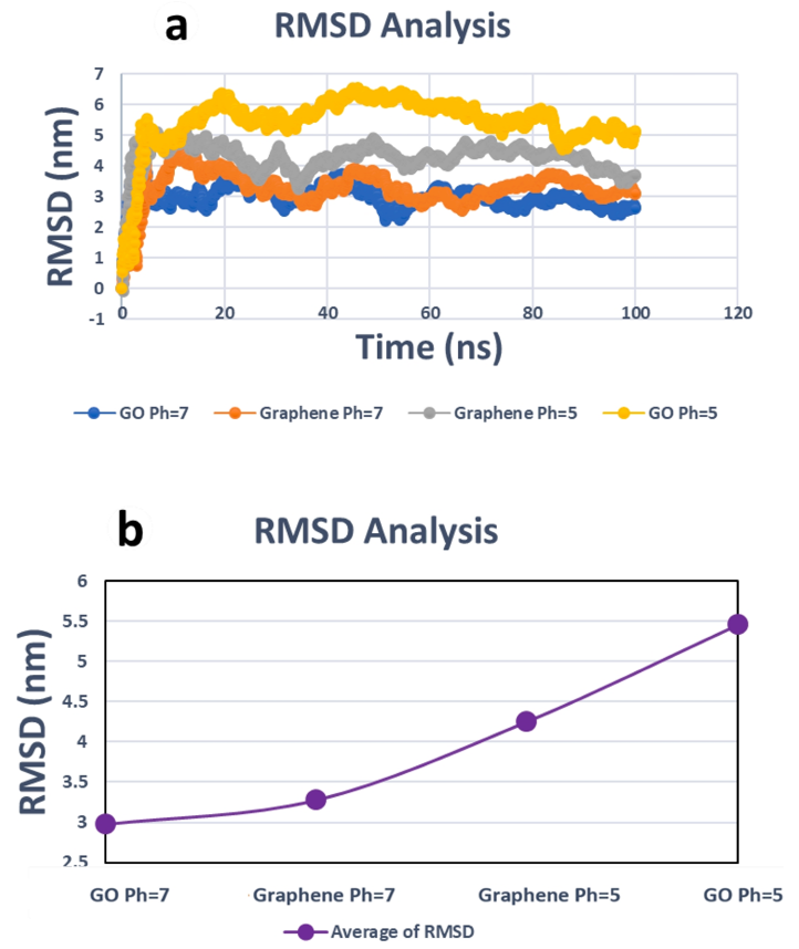 圖6. 含DOX藥物的氧化石墨烯(GO)和石墨烯在pH=7和pH=5時(shí)圖(a)中的時(shí)間依賴性RMSD分析和圖(b)中的平均RMSD值。