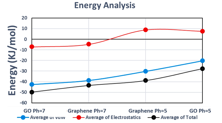 圖4. 含DOX藥物的氧化石墨烯(GO)和石墨烯在pH=7和pH=5時(shí)的范德華(VDW)和靜電學(xué)、總能量的平均值。