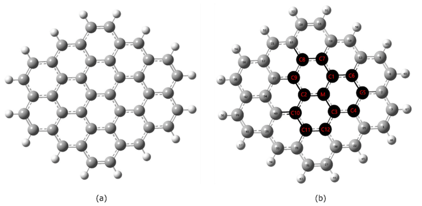 圖1. (a) 石墨烯的優(yōu)化構型(b)M代表摻雜在P-Gr中的金屬。