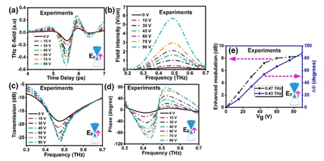 太赫茲(THz)場增強在高分辨率成像、下一代無線通信和網(wǎng)絡(luò)中有著重要的應(yīng)用。在這項工作中,本研究實驗證明了基于谷間散射理論的用于太赫茲場增強的石墨烯超表面。元表面的每個元原子由嵌入一個石墨烯片中的一個分裂環(huán)諧振器(SRR)組成。實驗結(jié)果表明,通過電調(diào)節(jié)石墨烯貼片的導電性,整個樣品的太赫茲場增強了23倍,0.47THz處的透射振幅降低了8.4dB。此外,在0.43THz處的最大相位差達到88°。實驗結(jié)果與仿真結(jié)果吻合良好。這項研究為探索太赫茲-物質(zhì)相互作用和非線性光學鋪平了道路。