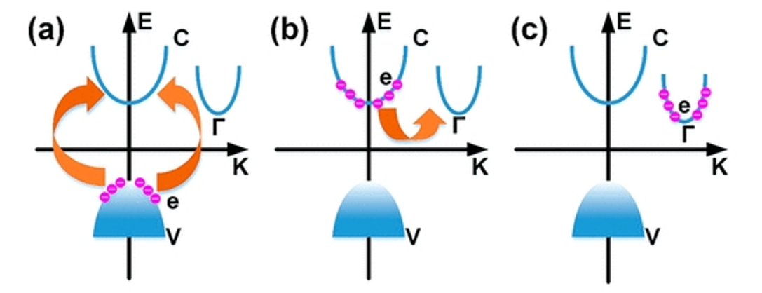 圖5. 谷間散射過程。(a) 價帶中電子的狀態(tài)。(b) 位于導帶的電子的狀態(tài)。(c) 位于Γ谷的電子的狀態(tài)。