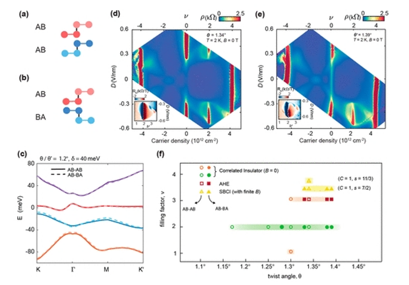 圖1. 在兩種堆疊配置中,在tDBG中觀察到的相關(guān)相位和拓撲相位的層次。(a,b)AB–AB和AB–BA tDBG的側(cè)視圖晶格示意圖。AB–AB(AB–BA)tDBG由兩個具有相同(相反)取向的Bernal堆疊石墨烯雙層組成。(c) 計算出θ=1.2°(AB–AB,實線)和θ′=1.2°的能帶結(jié)構(gòu)(AB–BA,虛線)tDBG,層間電位δ=40meV。紅色帶表示最低莫爾導帶。AB–AB(AB–BA)疊加中的Chern數(shù)為C=2(1)。(d,e)θ=1.34°(AB–AB)和θ′=1.39°(AB-BA)裝置的電阻率ρ