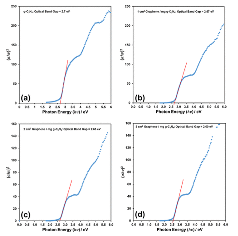 4的可見光利用率和光催化效率有很大貢獻(xiàn)。紫外-可見漫反射光譜測量也揭示了這一貢獻(xiàn),表明石墨烯的增量添加逐漸減少了納米復(fù)合材料的光學(xué)帶隙。在鋰離子氧電池的光輔助充電測試中,還觀察到g-C