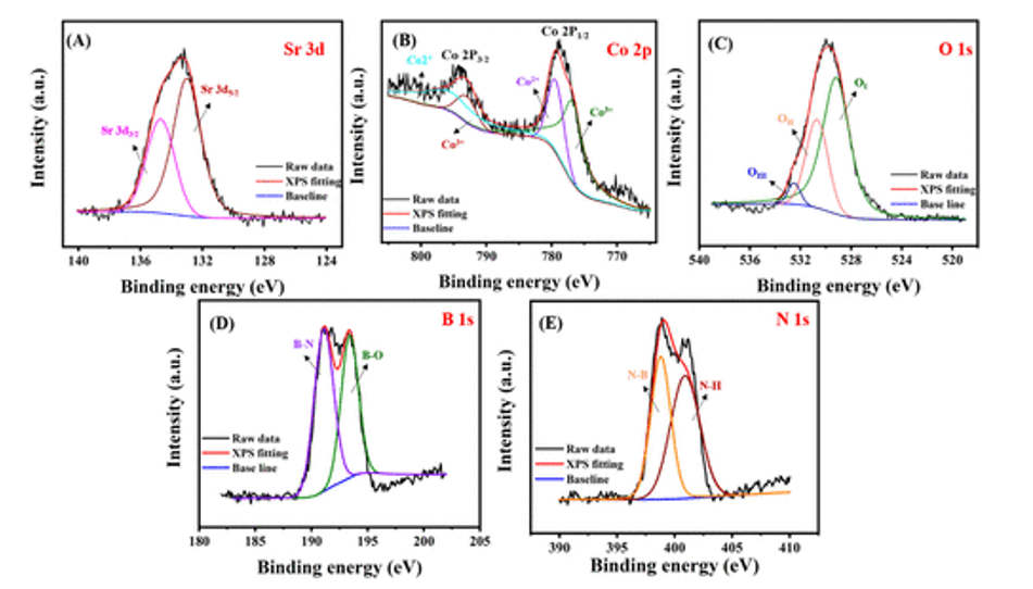 圖5. Sr3d(A)、Co2p(B)、O1s(C)、B1s(D)和N1s(E)的高分辨率反褶積XPS光譜。