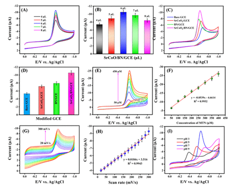 圖7. 改變MTN量(0.001–2351μM)的DPV響應(A)以及MTN濃度(μM)與電流(μA)的相應線性相關性圖(B)。在100μM MTN存在下,DPV響應、選擇性(C)、儲存穩(wěn)定性(D,G)、重復性(E,H)和再現性(F,I)的曲線圖和條形圖。所有實驗均在PBS(pH=7.0;0.05M)中的SrCoO3/BN改性GCE中進行。