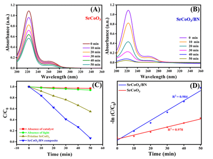 3/BN納米復合材料(B)的時間依賴性紫外-可見光譜。不同實驗參數的曲線圖(C)。SrCoO