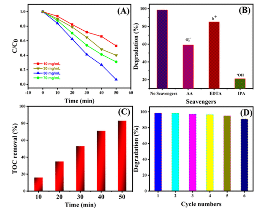 圖10. SrCoO3/BN納米復合材料用量的影響(A)?;钚晕锓N誘捕的探索(B)。SrCoO3/BN納米復合材料(C、D)的TOC和循環(huán)次數。