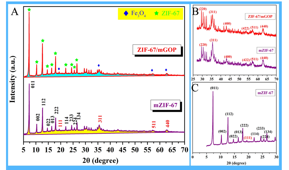圖3. mZIF-67和ZIF-67/mGOP的X-射線衍射(XRD)全光譜圖(A), mZIF-67和ZIF-67/mGOP的放大光譜圖(B),ZIF-67的放大光譜圖(C)。