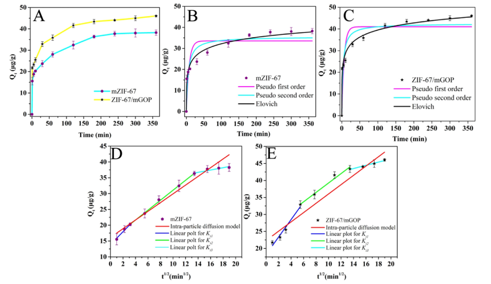 圖5. 時間對吸附量的影響(A),吸附動力學擬合曲線(B-E)。