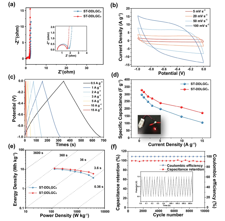 3的比電容(插圖顯示由紐扣型超級(jí)電容器供電的發(fā)光二極管)。 (e) ST-DDLGC