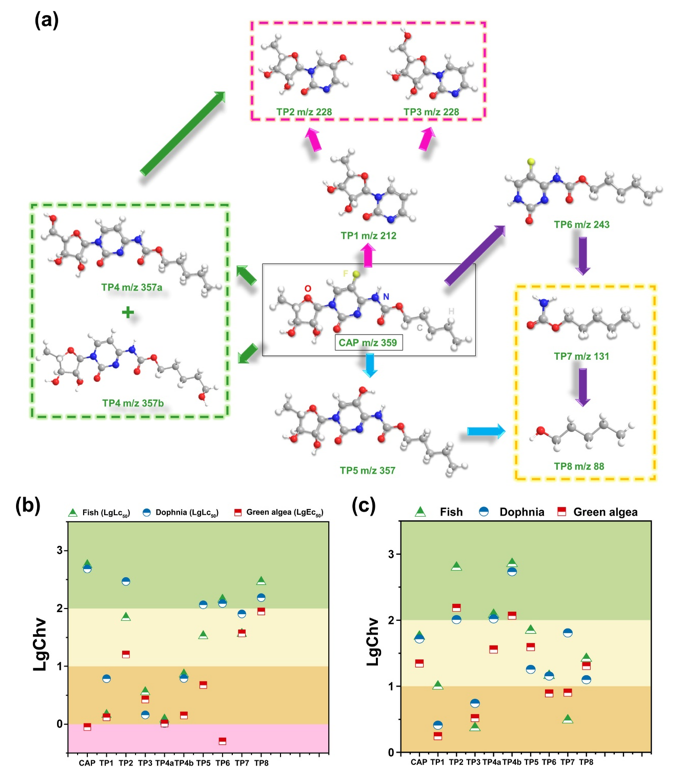 2/PMS 系統(tǒng)中 CAP 的擬議降解途徑,以及根據(jù)生態(tài)結(jié)構(gòu)-活性關(guān)系 (ECOSAR) 的 CAP 及其中間體的 (b) 急性毒性和 (c) 慢性毒性。