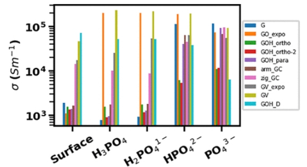 圖7. 石墨烯和功能化石墨烯化合物在吸附(清潔表面)之前和磷酸鹽在功能化的石墨烯表面上吸附之后的電導(dǎo)率。