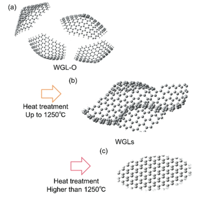 G的關(guān)系。(d) 通過程序升溫脫附(TPD)測量評(píng)估石墨層尺寸(L)。(b)和(d)中的虛線表示W(wǎng)GL-O的值。