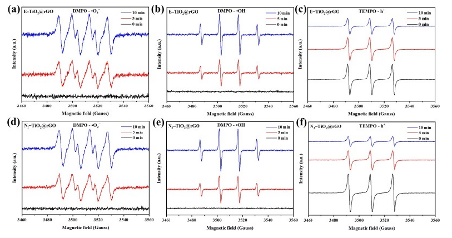 圖6. (a) pH 對制備的催化劑光降解2,4,6-TCP 的影響。(b) E-TiO2@rGO 和(c) N2-TiO2@rGO 納米片在消除2,4,6-TCP 過程中對環(huán)境陰離子的抗性(陰離子 = 1mmol · L-1)。(d) P25、 E-TiO2@rGO 和 N2-TiO2@rGO 納米片在連續(xù)三個循環(huán)中的可持續(xù)光催化降解性能的實驗。(e) E-TiO2@rGO 和(f) N2-TiO2@rGO 的自由基猝滅實驗。實驗條件: [2,4,6-TCP ] = 50mg/L,[催化劑] = 0.2 g/L,[清除劑] = 5mM,pH = 7,T = 25 ° C。