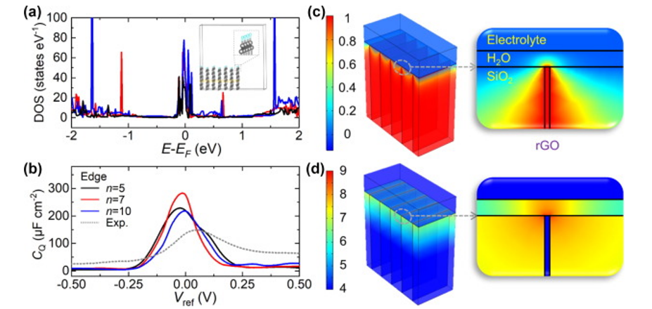 圖2. 基于石墨烯邊緣模型的理論計(jì)算。不同層數(shù)n的石墨烯邊緣結(jié)構(gòu)的計(jì)算DOS ( a )以及實(shí)驗(yàn)和計(jì)算的C Q - V ref曲線(xiàn)( b ) 。插圖a:DFT 模擬中七層石墨烯模型的優(yōu)化邊緣結(jié)構(gòu)。( c ) 使用 COMSOL 場(chǎng)模擬計(jì)算石墨烯邊緣的局部電壓分布。+ 1 V 施加到rGO,電解質(zhì)接地。( d )石墨烯邊緣的局部電場(chǎng)分布。使用對(duì)數(shù)刻度進(jìn)行更清晰的比較。