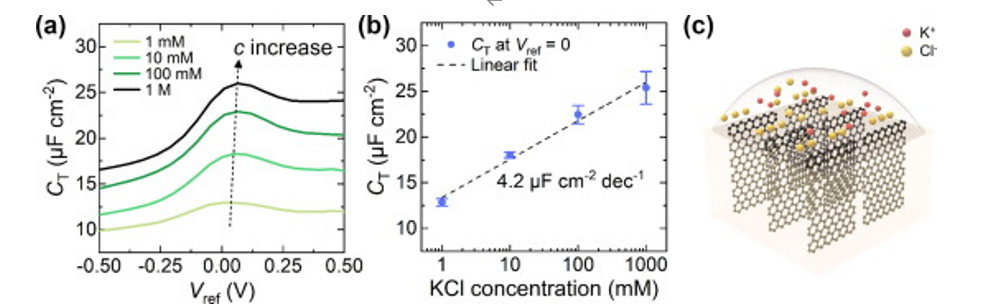 圖3. KCl 溶液中 QC 裝置的傳感性能。a、不同KCl濃度下的C T - V ref曲線(xiàn)。b,V ref = 0 V時(shí)C T的變化 作為 KCl 濃度的函數(shù)。c, rGO/SiO 2 QC傳感器的離子可能的傳感機(jī)制。
