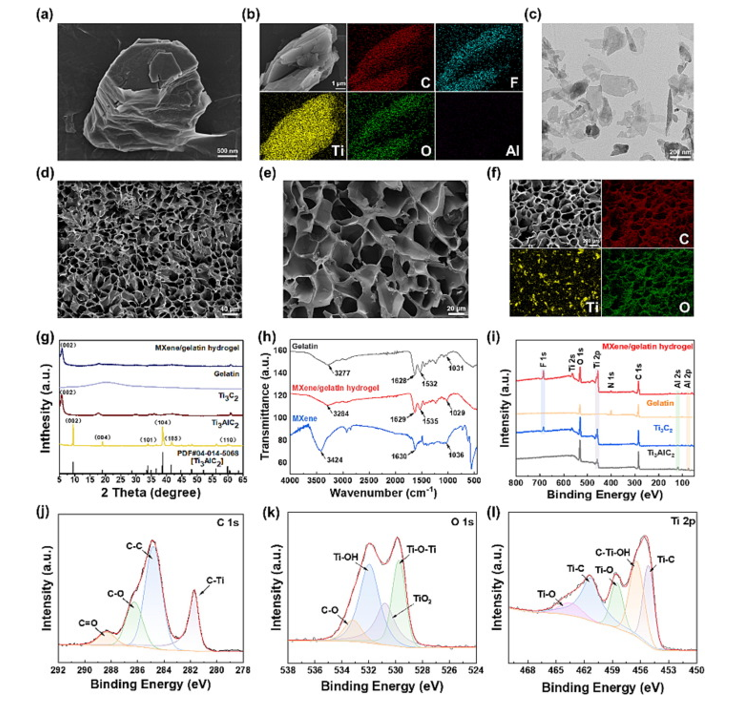 圖1. MXene及MXene/明膠水凝膠的組成分析及形態(tài)表征。(a) HF刻蝕后層狀Ti3C2的SEM圖像。(b)層狀Ti3C2的代表性SEM圖像和元素映射圖。(c) Ti3C2納米片剝離后的TEM圖像。(d, e) MXene/明膠水凝膠的SEM圖像。(f) MXene/明膠水凝膠的代表性SEM圖像和元素映射圖。(g) Ti3AlC2、Ti3C2、明膠、MXene/明膠水凝膠的XRD譜圖。(h)明膠、MXene和MXene/明膠水凝膠的FTIR光譜。(i) Ti3AlC2、Ti3C2、明膠和MXene/明膠水凝膠的XPS調(diào)查光譜。(j- 1) MXene/明膠水凝膠的高分辨率c1?s, o2?s和Ti 2p光譜。