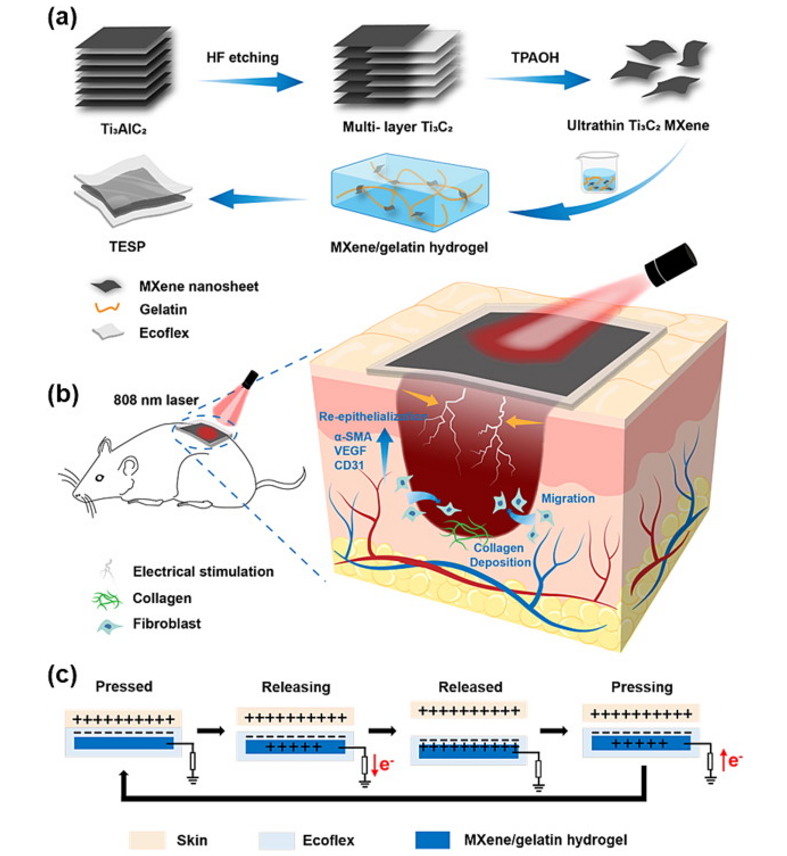 圖2. TENG電子皮膚貼片(TESP)的制備及應(yīng)用示意圖。(a)用MXene/明膠水凝膠制備TESP。b)使用近紅外響應(yīng)mxene的TESP對(duì)傷口愈合的示意圖。(c)可穿戴式TESP的工作機(jī)理。