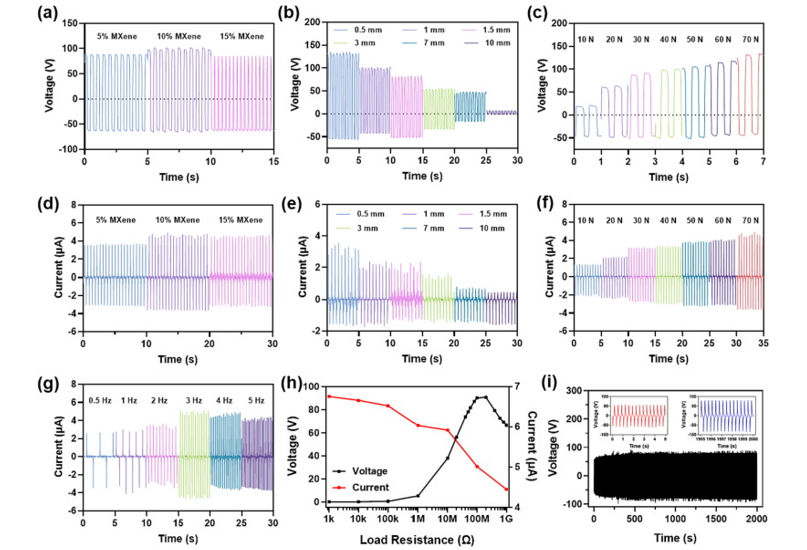圖3. TESPs的電輸出性能。(a, d)在2?Hz頻率下,施加60?N的力時(shí),含5?%、10?%和15?% MXene的水凝膠的TESPs的電壓和電流。(b, e)不同Ecoflex厚度的10?% MXene水凝膠在2?Hz頻率下施加60?N的力時(shí),TESPs的電壓和電流。(c, f)含10?% MXene的水凝膠在2?Hz頻率下不同施力量下TESPs的電壓和電流。(g)在不同工作頻率下,當(dāng)作用力為30?N時(shí),含有10?% MXene的水凝膠對(duì)TESP產(chǎn)生的電流。(h)在外力為60?N,頻率為2?Hz的情況下,含10?% MXene的水凝膠在不同負(fù)載阻力下的輸出電壓和電流。(i)含10?% MXene的水凝膠在3?Hz下施加60?N的力時(shí),TESP的耐久性。插圖:圖的局部放大圖。