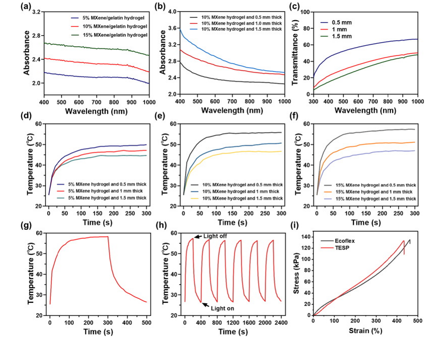 圖4. TESPs的光學(xué)、機(jī)械和光熱特性。(a)不同MXene含量的MXene/明膠水凝膠吸光度。(b) 10?% MXene水凝膠和不同Ecoflex厚度(0.5、1、1.5?mm)對(duì)TESP吸光度的影響。(c)不同厚度Ecoflex的透光率。(d-f)含5?%、10?%和15?% MXene的水凝膠和不同Ecoflex厚度的TESP在1?W?cm−2的808?nm近紅外激光照射下的光熱加熱曲線。(g)使用10?% MXene和1?mm Ecoflex水凝膠的貼片加熱和冷卻曲線。(h) TESP光熱循環(huán)。(i) Ecoflex彈性體薄膜與TESP的應(yīng)力應(yīng)變曲線。