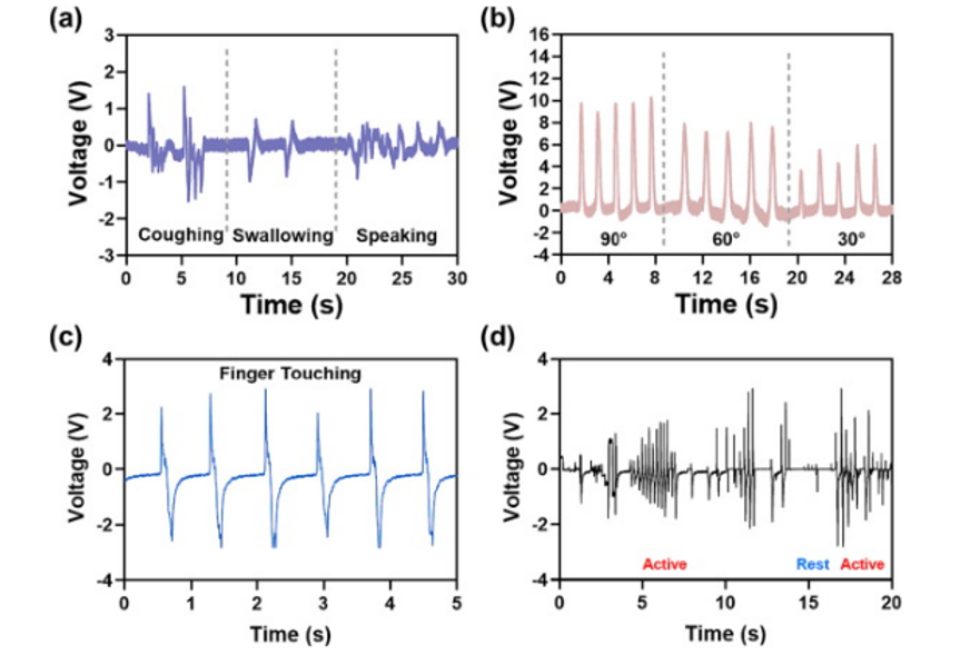 圖5. TESP作為可穿戴傳感器的演示。(a)貼在志愿者喉嚨上的TESP和輸出的監(jiān)測(cè)咳嗽、吞咽和說(shuō)話的電信號(hào)。(b)手指彎曲不同角度的電響應(yīng)。(c)手指觸摸檢測(cè)電壓。(d)小鼠運(yùn)動(dòng)誘導(dǎo)的TESP輸出電壓。