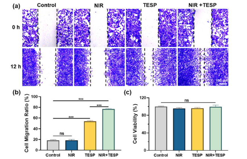 圖6. 近紅外輻照下TESPs電刺激及光熱效應(yīng)對(duì)小鼠成纖維細(xì)胞的影響。(a)利用小鼠胚胎成纖維細(xì)胞進(jìn)行細(xì)胞遷移研究(NIH-3?T3)。(比例尺:100?µm)。(b)對(duì)照組、NIR組、TESP組、TESP組與NIR組的細(xì)胞遷移率(*p?<?0.05)。(c) NIR、TESP、TESP加NIR處理24?h后NIH-3?T3細(xì)胞活力(*p?<?0.05)。
