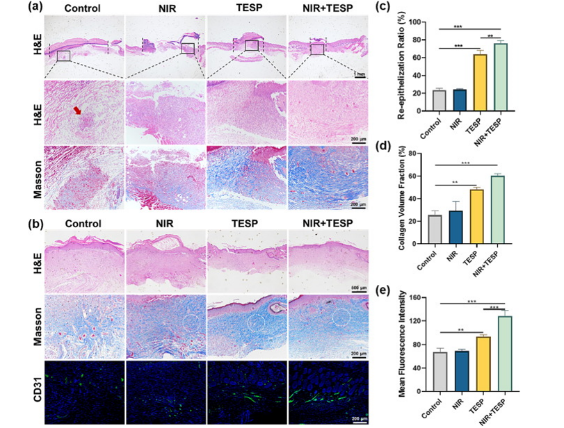 圖7. TESP對(duì)體內(nèi)創(chuàng)面模型的影響。(a)在808?nm、0.7?W?cm−2的近紅外激光照射120?s后,經(jīng)TESP處理或不經(jīng)TESP處理的小鼠的溫度變化熱像圖。(b)在120?s的照射下,有或沒(méi)有TESP的創(chuàng)面光熱加熱曲線。(c)對(duì)照組、NIR組、TESP組和NIR組分別于第0、3、5、7、10天獲得皮膚創(chuàng)面圖像。在前三天進(jìn)行NIR、TESP和TESP加NIR治療。(d)傷口愈合率。(e)小鼠在治療期間的體重。