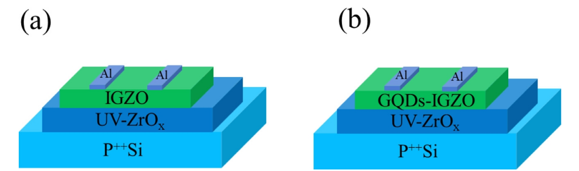 圖1. (a)脫摻雜和(b) GQDs摻雜通道層的IGZO TFTs示意圖。