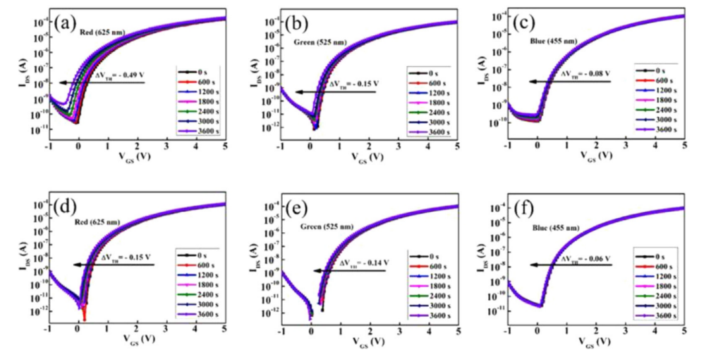 圖7. (a-c) GQDs-IGZO-0 TFT和(d-f) GQDs-IGZO-2 TFT在紅、綠、藍(lán)三種光照射下PBIS測試下的傳遞曲線。