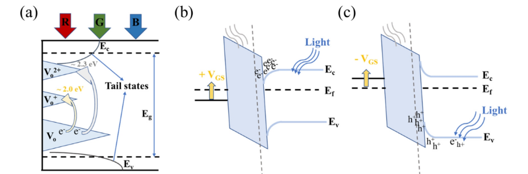 圖10. (a) GQDs-IGZO TFT中Vo相關(guān)阱態(tài)的光致電離示意圖。(b) PBIS和(c) NBIS在光照下柵電介質(zhì)中固定電子的積累。