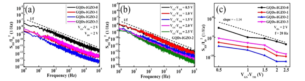 x TFTs的低頻噪聲(LFN)特性表明,遷移率的波動(dòng)是噪聲源?;谒袑?shí)驗(yàn)結(jié)果,可以得出結(jié)論,溶液處理的GQDs-IGZO/ZrO