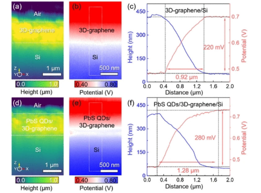圖2. (a,b)3D石墨烯/Si橫截面處的形態(tài)和電勢(shì)圖的同時(shí)測(cè)量。(c) 等值線(xiàn)圖,說(shuō)明垂直方向上的高度和電位分布,對(duì)應(yīng)于部分(a)和(b)。(d,e)在PbS量子點(diǎn)/3D石墨烯/Si橫截面處的共形和電勢(shì)圖的同時(shí)測(cè)量。(f) 描繪垂直方向上高度和電位分布的等高線(xiàn)圖,對(duì)應(yīng)于圖(d)和(e)。